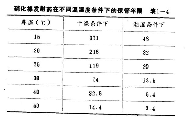 1- 4是硝化棉发射药在不同温湿度条件下的保管年限,从